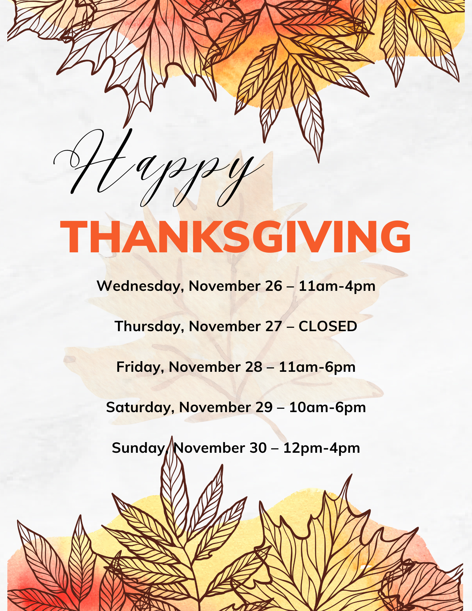 Store HoursSunday: 12PM - 4PMMonday: CLOSEDTuesday - Saturday: 11AM - 6PM